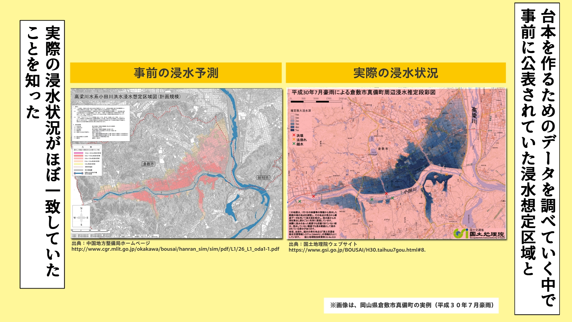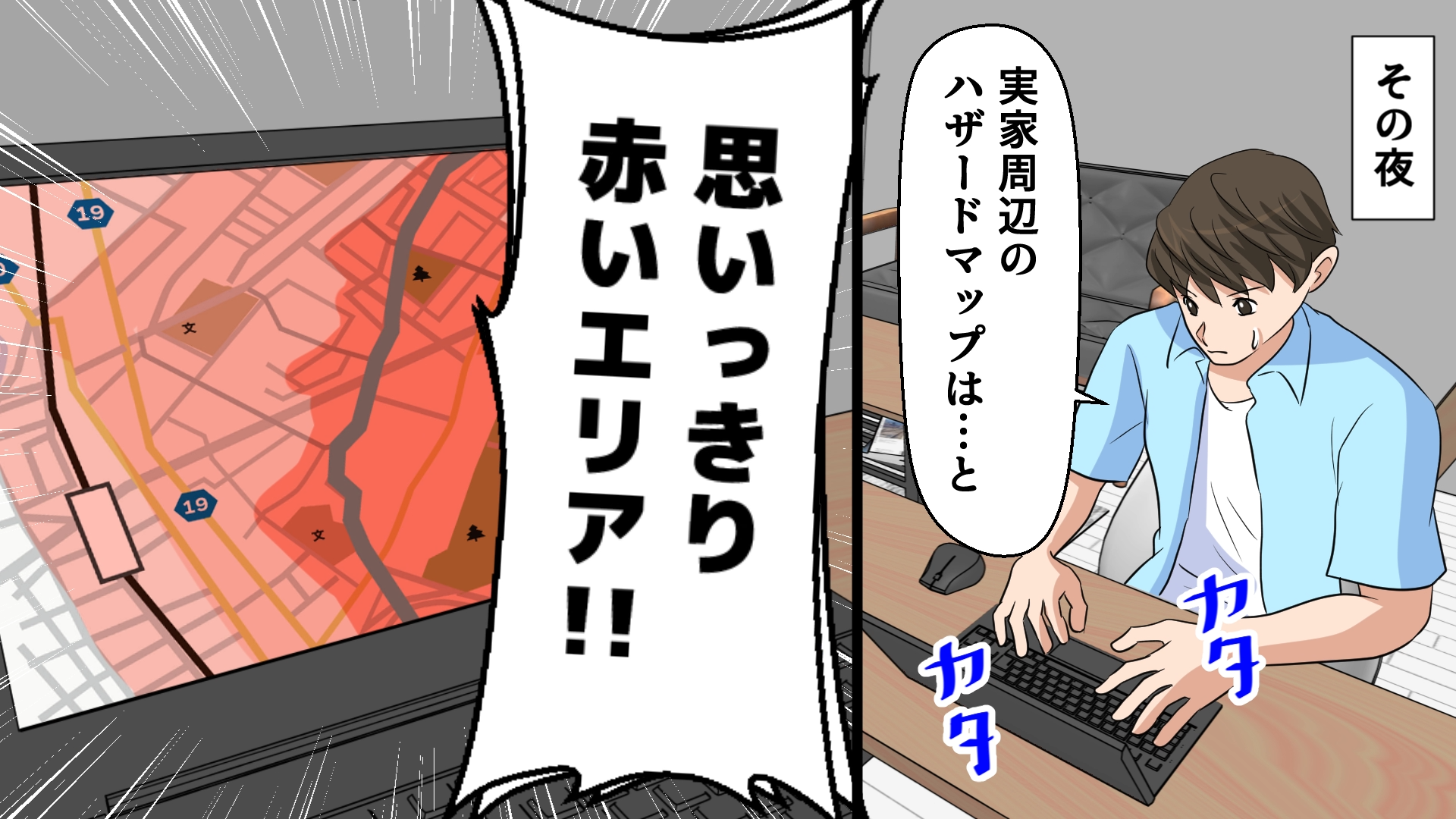 事前に公表されていた浸水想定区域と実際の浸水状況がほぼ一致している実例があったことを知った主人公。